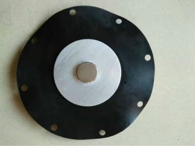 电磁脉冲阀膜片是一个由安装有用来封堵压缩空气管道或者说封堵阀的出气口的铆头,放气卸荷孔和四周有固定支撑用的螺栓孔的一整张橡胶膜片,是电磁脉冲阀中的关键控制部件。